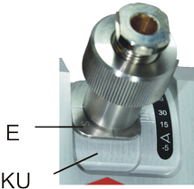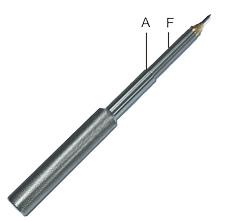 Die genaue Führung (F) und der Anschlag (A) am Elektrodenhalter garantieren