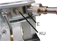 ![]() | Die drei Schleifbahnen auf der Diamantscheibe werden durch einfaches Versetzen des Führungselement (E) und Verschieben der Kulisse (KU) eingestellt. |