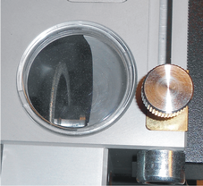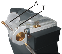 Mit der Trenneinheit (T) können Wolframelektroden auf die gewünschte Länge getrennt werden. Abgetrennte Elektrode befindet sich im Auffangbehälter (A)